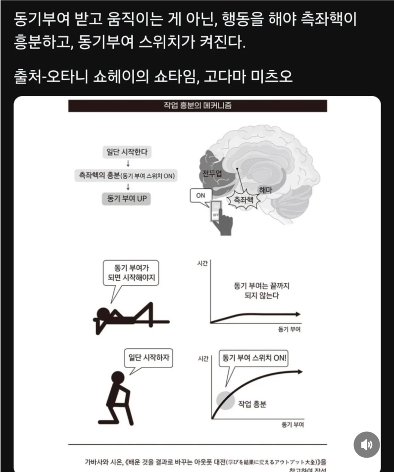 우리는 왜 미루게 될까? 많은 사람들이 오해하는 부분이 바로 이것이다. 사람은 사실 동기부여를 받고 시작하는게 아니고, 하면서 동기가 부여된다는 것이다. 즉, 우리가 생각하는 순서가 완전히 뒤바뀌어 있었던 것이다. '동기 → 행동'이 아니라 '행동 → 동기'인 셈이다.