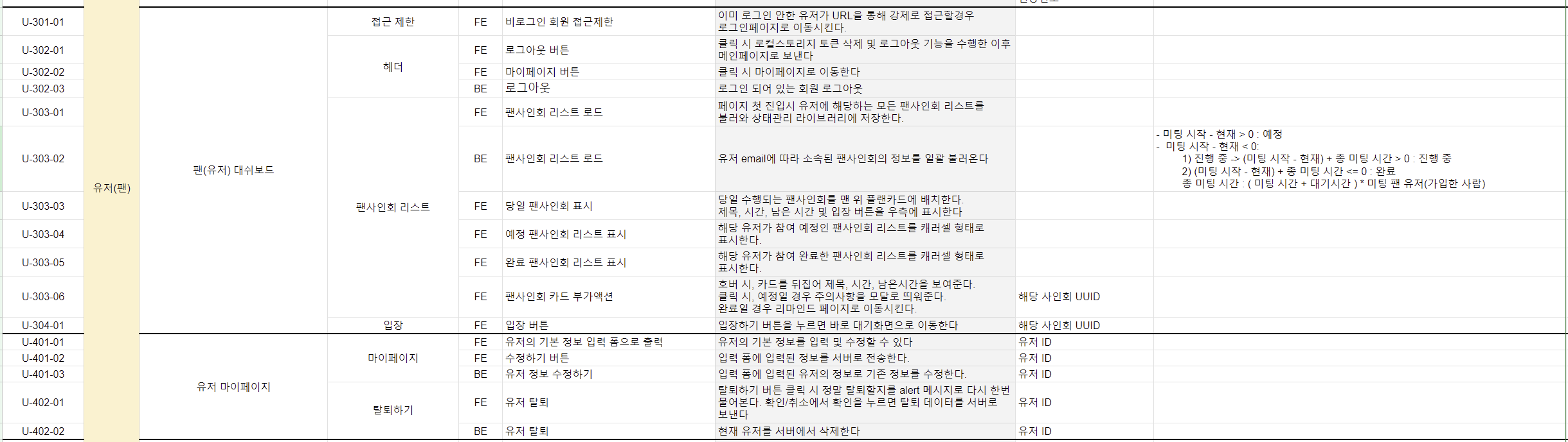 이렇게 해결책을 정리한 후 요구사항 정의서를 우선 작성했다. 우선 팬, 소속사, 연예인으로 나누고, 또 각각의 서비스에 따라 나누었다. 기능명/내용/중요도를 작성하고 추가적으로 작성할 사항이 있다면 비고에 작성했다.